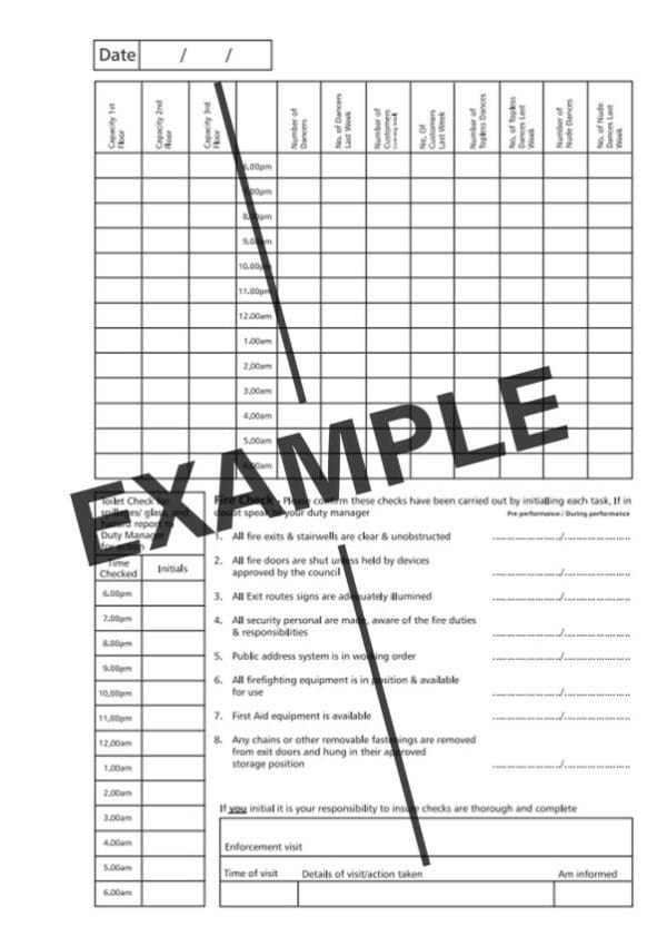 - It has signing in information for the dancers, Security staff, Duty Manager and other staff.