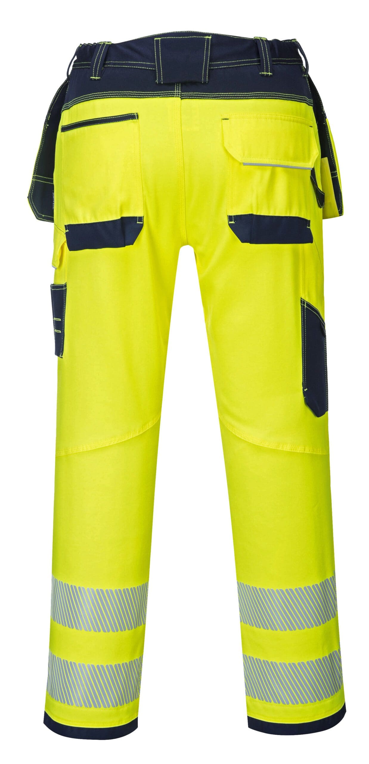 A thoughtfully designed, innovative hi-vis trouser featuring multi-functional holster pockets, top loading kneepad pockets and an easy access multiway thigh pocket for secure storage of phone, keys and tools. Oxford fabric reinforcement at key abrasion points and triple stitching throughout guarantee maximum durability.